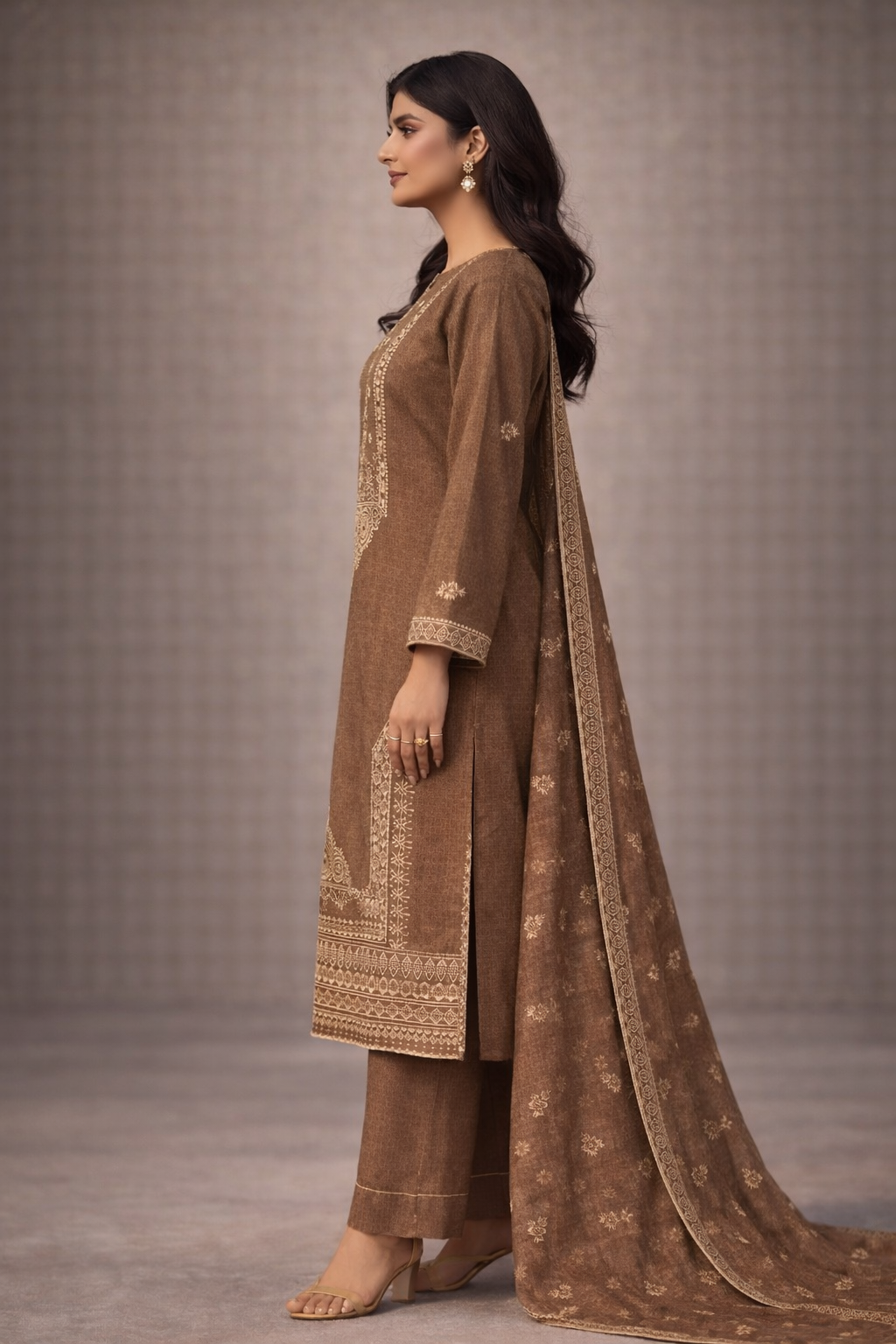 Discover timeless elegance with our Luxury Embroidered Winter 3-Piece Unstitched Suit, designed for women who appreciate refined Pakistani craftsmanship. Featuring a beautifully embroidered front panel, subtle sleeve detailing, and a clean, minimal back, this outfit offers a perfect balance of luxury and sophistication.